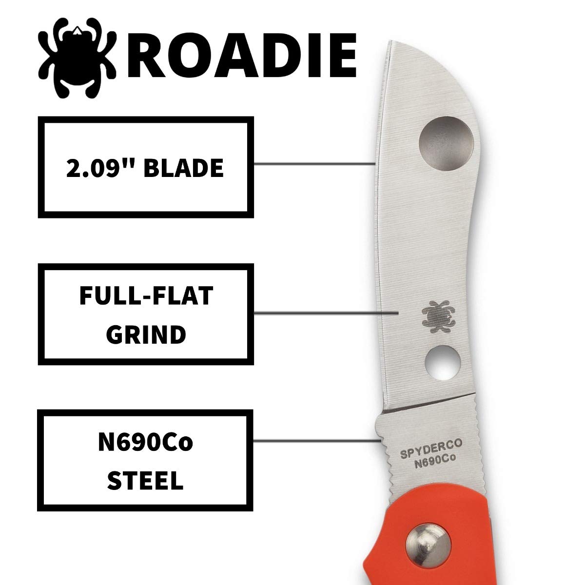 - Superior Blade Steel: Every Roadie has a sheepfoot-style blade ground from Bohler-Uddeholm N690Co steel, a high-performance stainless steel alloyed with cobalt, molybdenum, and vanadium.